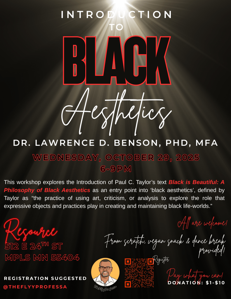 Introduction to Black Aesthetics: This workshop (and eventual class) explores the Introduction of Paul C. Taylor’s text Black is Beautiful: A Philosophy of Black Aesthetics as an entry point into ‘black aesthetics,’ defined by Taylor as “the practice of using art, criticism, or analysis to explore the role that expressive objects and practices play in creating and maintaining black life-worlds.” We will define key terms, discuss Taylor’s discursive trajectory, and respectfully challenge our own, Taylor’s, and others’ views and definitions en route to a more robust way of encountering black expressive objects and practices of the literary, visual, and performing arts. We will ground this introduction with poems, fiction excerpts, song lyrics, and film/video clips that provide an opportunity to connect the works, people, and bodies in black life-worlds to the inherently aesthetic, thus philosophical nature of blackness in the United States. 3hrs (with 15 min vegan snack & dance break). Suggested donation: $1-$10.✌🏾Wednesday, October 29, 2025, 6-9pm, Resource Mpls, 512 E 24th St, Mpls MN 55404 — Free registration suggested here.